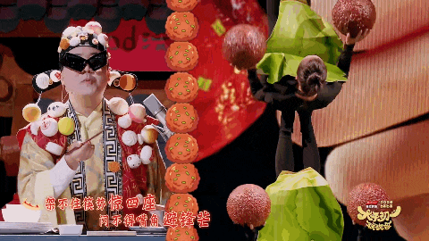 比如《大年初一封饭榜》这个节目,喜人出身的土豆装扮成财神爷,表演起东北喊麦,和他搭档的是广州杂技团,杂技演员在台上cosplay成各种美食,舞台上出现了一幅神奇的画面:烧鹅们排队后空翻,披萨们挨个滚环。喊麦认真唱道,要为年轻人“夺回年夜饭的主权”,哪怕是泡面、奶茶、各种预制菜,于是杂技演员扮演成肉串,一片踩着一片,在高空中翻跟头……